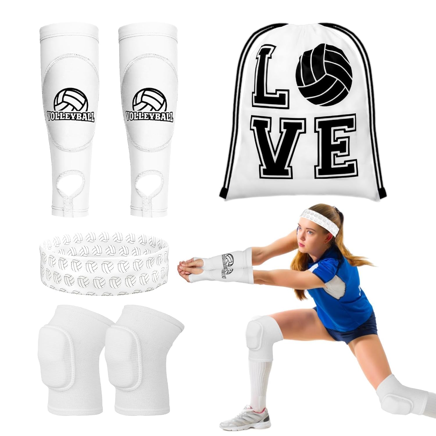 Features: Reduces friction and rubbing: The volleyball knee pads and arm sleeves are designed to reduce friction and rubbing, which are common during volleyball play. This can help prevent skin irritation and abrasions, making your gaming experience more comfortable. Comfortable Experience: These arm pads for volleyball are elastic and comfortable to wear, and can provide cushion for kids' arms during volleyball practice, the sports tie headband can absorb sweat and keep the trainer's forehead dry. Our volleyball accessories are not only suitable for playing volleyball, but also can be applied in other sports such basketball, soccer, football, baseball and so on. Color: Volleyball knee pads: pink,black,blue,white Volleyball arm sleeves: pink,black,blue,white Sweat band: pink,black,blue,white Drawstring bag: pink,black,blue,white Package includes: 1 Pair volleyball arm sleeves 1 Pair volleyball knee pads 1 x Tie headband 1 x Drawstring bag Enable longer game time: By providing additional support and protection, the volleyball set can help you play longer without experiencing fatigue or discomfort.