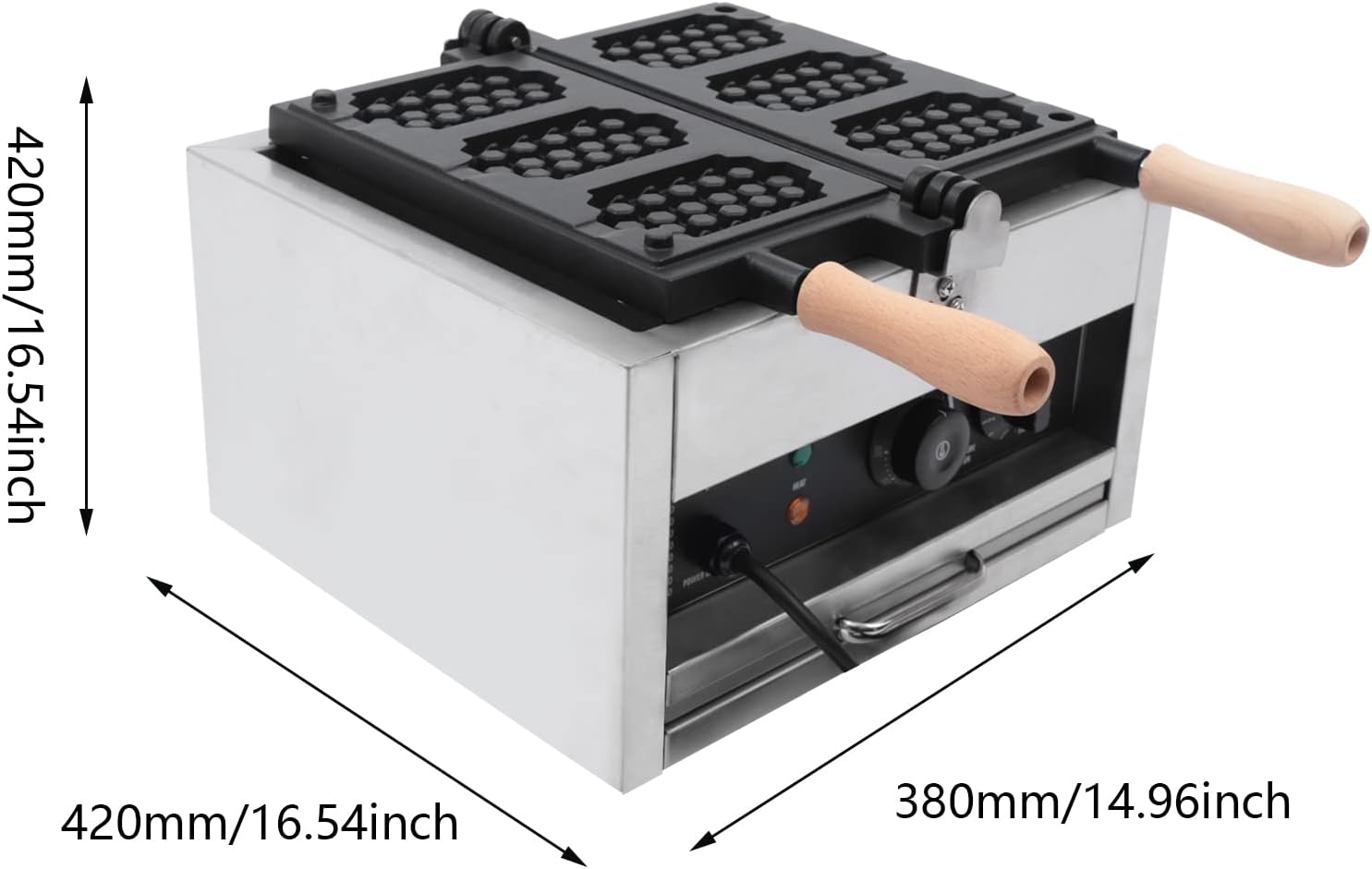 DetailsWooden Handle: The waffle maker has two wooden handles for easy turning of the baking tray. The insulated wooden handle does not conduct heat, so it won't burn your hands when baking waffles.Four Foot Pads: This waffle maker has four non-slip foot pads on the bottom to ensure a stable placement of the machine. It also protects the table from scratches.Indicator Light: There are two indicator lights on the waffle maker. One is the yellow heating light, and the other is the green power light. They can tell you the working status of the machine, which is very convenient and practical.Crumb Tray: This machine has a tray at the bottom which can be used for holding waffle crumbs or used oil to keep the table clean. It is designed to be hidden on the bottom, saving space.Stainless Steel Conductor Tube: The stainless steel conductor tube protects the wires from exposure and is water and corrosion-resistant, making it safer to use.How to Use1. Adjust the heating knob to 180 degrees to preheat. When the red heating light goes out, indicating that it has reached 180 degrees, then pour the batter in.2. Cover the template and adjust the timer knob to 3-4 minutes according to your habits.3. Turn the batter from side to side 3-4 times and wait for the timer to finish.4. Set the temperature knob to 0 to prevent dry burning.5. Remove the waffle from the waffle maker.SpecificationMaterial: Stainless Steel+Cast AluminumPlug: American StandardColor: Silver and BlackMold Coating: Special CoatingAdjustable Temperature:50-300°C / 122-572°FTiming: 1-5minWattage: 1400WVoltage: 110VCapacity: 3 WafflesFinished Waffle Size: 120*70*20mm/4.72*2.76*0.79inchPacking Size: 42*37.5*27cm/16.53*14.76*10.62inchProduct Size: 380*420*420mm/14.96*16.54*16.54inchGross Weight: 12kg/26.45lbsNet Weight: 11kg/24.25lbsPackage Included1 x Waffle Maker1 x English Manual